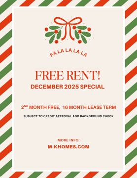 Special applies to any single family home, valid for any move in 12/1/2025 -12/31/2025. Free month applies to 2nd month of 16 month lease.