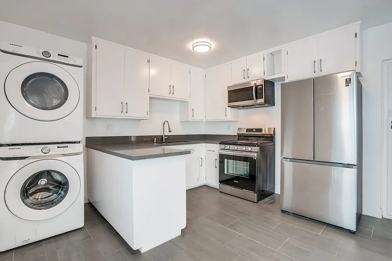 Floods of natural light shine through dual pane windows as you enter into a spacious living room with hardwood floors and recessed lighting. The updated kitchen is stocked with stainless steel appliances, quartz counters, a large farmers sink and a dishwasher. Plus, your have your own high quality, stackable W/D!