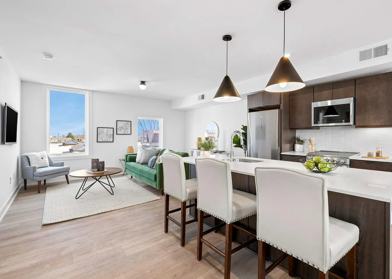 The building is pet-friendly and boasts a clean, minimalist design with unique architectural details. Units primarily feature 1 and 2-bedroom layouts with modern finishes, including quartz countertops, stainless steel appliances, mocha cabinetry, tile backsplashes, pendant lighting, and garbage disposals. Bathrooms offer crisp tile flooring, storage vanities, chrome fixtures, and stylish mirrors. Wide plank oak flooring is featured throughout, and select two-bedroom units offer an additional full bathroom.