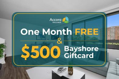 Rent Special available! Limited Time Offer: 1 Month Free PLUS $500 Shopping Spree! Sign a lease this season & get one month free PLUS a $500 Bayshore Shopping Centre gift card . Refer a friend or family member to join our community and you’ll both receive a $250 rent credit . Conditions apply. Offer valid while quantiti