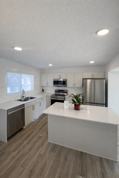 The property features a bright open living area with large windows that bring in plenty of natural light. The kitchen is fully equipped with fridge, range, microwave, and dishwasher, along with ample cabinet space for storage.