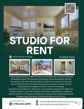 Freshly updated studio, 1-bathroom ground level apartment located in the Knob Hill Neighborhood. This charming unit features brand new laminate flooring throughout, fresh paint and new cabinets. Enjoy the convenience of having a ground level entry with off street parking at your doorstep. Unreserved and ample parking is available in the lot in front of the building. Situated in School District 11, this home is conveniently located near E Platte Ave, making it ideal for commuters. Nearby attractions include Military Installations, Betty Krouse Park, US Olympic & Paralympic Training Center, Memorial Park and Prospect Lake, Downtown Colorado Springs, and much more. Features: - NEW Carpet & LVP flooring - Legacy trees provide plenty of shade - Parking lot - School District 11 - Built 1936 Utilities: - A Flat Rate of $75/month for Utilities (Water, Sewer, Gas & Trash) will be charged by the Management Company, along with a $5.00 per month Administrative Processing Fee. - Residents are responsible for setting up individual Electric service in their name and paying directly to Colorado Springs Utilities for the duration of the lease term. Account number must be provided to PPG at lease signing. Move-in Special: - Military personnel receive half off the application fee with a valid military ID. - First Months Rent Half Off! Pet Policy: - Dogs/Cats are welcome. - Limit of 1 mature cat and 1 mature dog under 45lbs. - A pet deposit of $200 and pet rent of $35/Mo per pet will apply. Smoking Policy: - No smoking or marijuana permitted. *Disclaimer: Photos may include virtual staging and/or images of a similar unit. Actual unit features, layout, and furnishings may vary. We’re excited to offer AppFolio Guard, providing a secure and simple way to manage your security deposit. This service allows for payment installments, ensuring a smooth and transparent process with timely updates and clear documentation throughout your tenancy! Don’t wait—homes in this area go fast! A prospective tenant has the right to provide to the landlord a portable tenant screening report, as defined in section 38-12-902(2.5), Colorado Revised Statutes; and If a prospective tenant provides the landlord with a portable tenant screening report, the landlord is prohibited from: Charging the prospective tenant a rental application fee; or Charging the prospective tenant a fee for the landlord to access or use the portable tenant screening report. Contact Us: Progressive Property Group LLC 719.748.6723 **** *This property is part of PPG’s Featured Referral Program.