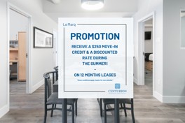 PROMOTION: Receive a $250 move-in credit and a discounted rate during the summer! - On 12 months leases!