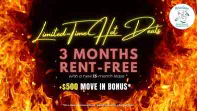 Rent Special available! THREE MONTHS RENT FREE + $500 MOVE IN BONUS! Receive 3 MONTHS RENT-FREE + $500 MOVE IN BONUS! This limited time offer applies to new applications with a new 15-month lease term.