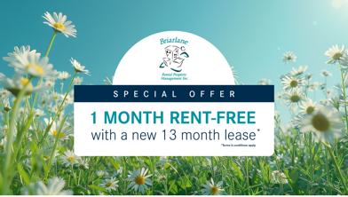 Rent Special available! First Month Rent Free! Receive your FIRST MONTH RENT FREE! This limited time offer is available for new applications on select suites with a 13 month lease term. Contact our leasing agent for further details!