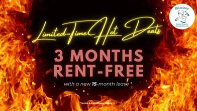 Rent Special available! THREE MONTHS RENT FREE Receive THREE MONTHS RENT FREE! This limited time offer is available for new applications on select suites with a 15 month lease term. Contact our leasing agent for further details!