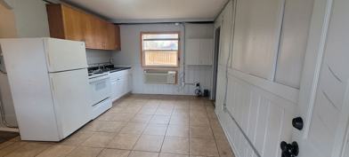 There is a bathroom right off of the kitchen that has a sink, toilet and shower. The kitchen features a stove/oven and refrigerator.
