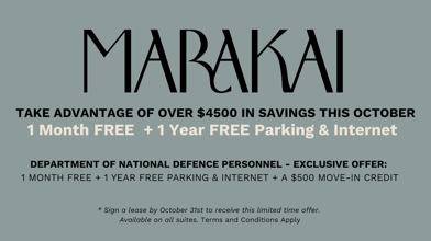 Rent Special available! Take Advantage of Over $4500 in Savings this October! 1 Month FREE + 1 Year FREE Parking & Internet Available on all suite types. Terms and Conditions Apply. Limited Time promotion.