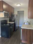 Beautiful plank flooring in a rich wood-tone finish throughout apartment, updated functional kitchen with sleek wood cabinets and stainless steel appliances including dishwasher and built-in microwave. Great closet space. Modern color scheme with cool gray walls and contemporary white doors and trim.