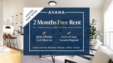 Rent Special available! 2 Months Free Rent - Up to 2 Weeks Early Move-In - $500 off Security Deposit Make your winter move easier (and way more affordable). For a limited time, winter move-ins receive 2 months FREE rent, the chance to move in up to 2 weeks early, and 50% off the security deposit.