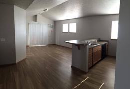 These 659 square foot units are the largest one bedrooms of the complex. The entrance to the apartment is next to the kitchen. The kitchen comes equipped with a range, refrigerator, dishwasher, and microwave. A raised bar around the sink easily sits three. A sliding glass door from the living room accesses the private deck and exterior storage closet. The decks face either to the north or south. The air conditioner is mounted in the wall next to the patio door. The laundry closet is located in between the bedroom and bathroom, a washer and dryer are included. Windows in the bedroom also look either to the north or south.