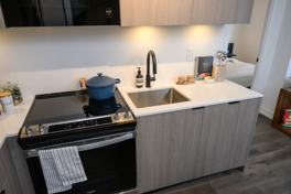- Elegant quartz backsplashes and stainless steel undermount kitchen sinks with stylish faucets.