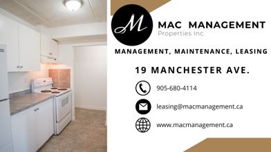 19 Manchester Ave. 19 Manchester Ave, St. Catharines, ON is a rental apartment building with 1 floorplan available. It is located in the York - Haig neighborhood of St. Catharines. It has apartment amenities including on-site laundry, assigned parking, air conditioning, and balcony. It has building amenities including on-site laundry, and outdoor space. Cats and dogs are allowed, making it a pet-friendly building.
