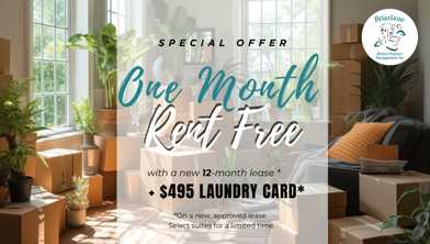 Rent Special available! ONE MONTH RENT FREE + $495 LAUNDRY CARD Receive 1 MONTH RENT-FREE + $495 Laundry car