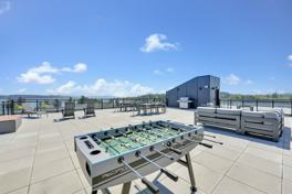 Amenities include a fitness center, social lounge, rooftop patio, outdoor courtyard with a fire pit, BBQ and dining areas, a fenced dog run, and more.