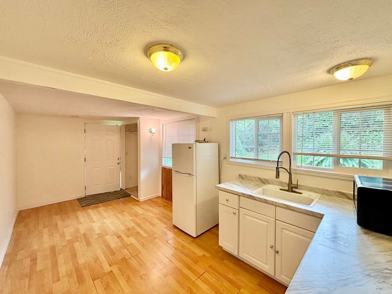 This private studio is located at the back of the house and features its own entrance on the side. The entry area includes closet space, and the kitchenette is equipped with ample cabinet storage, a refrigerator, a microwave, and a sink. The unit also includes a private bathroom with a shower. Street parking is available.