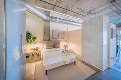 This freshly painted, move-in ready unit is bathed in natural light throughout the day and features a wide, open floor plan with soaring ceilings and rich industrial design elements. Polished concrete floors, exposed piping, and gleaming white walls create a striking contemporary aesthetic.