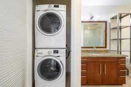 Welcome to this bright and open 1-bedroom, 1-bathroom home, offering stunning views of Mission Creek from the living room, bedroom, and private balcony, all within a modern and secure building. Also included is a dedicated storage unit, and a deeded parking spot inside the gated garage. Enjoy the modern chefs kitchen with stainless steel appliances, granite countertops, cherry oak cabinets, hardwood floors, carpeted bedroom, and a breakfast bar. Custom pantry off the kitchen and high-end custom walk-in closet with organizers and built-in drawers off the master bedroom. A spacious bathroom includes a shower-over-tub, built-in towel/linen shelving unit and full-sized washer/dryer. The parking spot is ideally located and easily accessible. Park Terrace offers fantastic amenities, including keyed entrance and elevator systems for security, fitness center, landscaped courtyard with BBQ,
