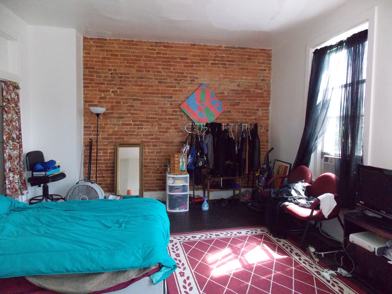 This sunny top floor unit in in historic Old Goucher offers a Spacious bedroom with a large closet; an extra large master bathroom with tub/shower combo and a large linen closet; a very spacious eat-in kitchen with a gas stove, a dishwasher, a full size fridge, and plenty of room for additional prep and table space; and a gorgeous living room with an exposed brick accent wall, two large windows, and an original decorative mantle. Original hardwood flooring in the living room and bedroom, tile flooring in the kitchen and bathroom. In-unit washer/dryer.