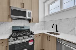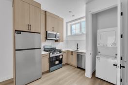 Contemporary kitchen with stainless steel appliances including fridge, stove, and microwave.