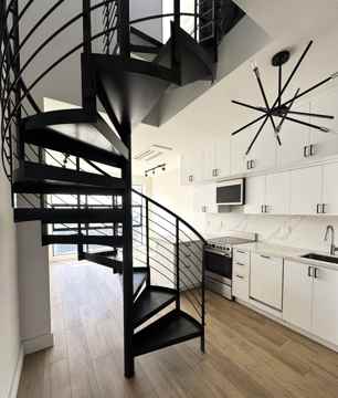 The apartment features wide-plank flooring throughout the living space, a contemporary kitchen with stainless steel appliances, quartz countertops, and custom cabinetry, as well as matte black fixtures and hardware for a clean, modern finish. Enjoy the added comfort of air conditioning and the convenience of an in-unit stackable washer and dryer. Expansive industrial-style windows bring in abundant natural light, while the elegant bathroom includes herringbone tile flooring, a floating vanity, and a frameless glass shower.