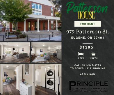 979 Patterson Street 979 Patterson St, Eugene, OR is a rental apartment building with 14 floorplans available. It is located in the West University neighborhood of Eugene. It has apartment amenities including wi-fi, air conditioning, oven, dishwasher, in-unit laundry, and balcony. It has building amenities including storage, and elevator.