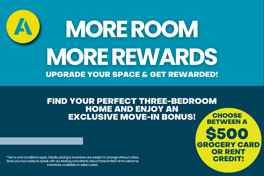 Rent Special available! More Room, More Rewards - Upgrade Your Space & Get Rewarded! Find your perfect three-bedroom home and enjoy an exclusive move-in bonus — choose between a $500 grocery card or rent credit! Terms and conditions apply.