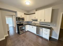 As you enter through the front, you’re welcomed by a large living area filled with natural light from oversized windows. The kitchen features plenty of cupboard space and ample room for a kitchen table and chairs — perfect for everyday dining.