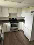 The kitchen is equipped with essential appliances and plenty of cabinet space, making meal preparation a breeze. Large windows throughout the unit allow for an abundance of natural light, enhancing the warm and inviting ambiance.