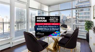 Choose from pet-friendly 1- and 2- bedroom suites, 2-bedroom + den layouts, and penthouses—all thoughtfully designed with high ceilings, granite countertops, floor-to-ceiling windows, and large balconies. For a limited time, enjoy a reduced security deposit of $499.