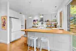 *Renovated kitchen with a large island serving as a lunch counter, open to the dining room and living room.