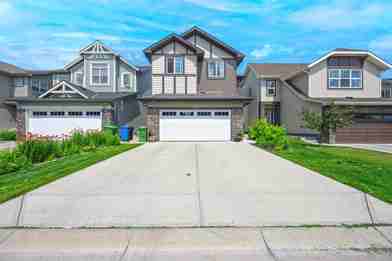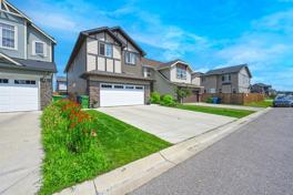 Welcome to this charming two-story home located in the dynamic community of Skyview Ranch. This spacious residence offers a comfortable and functional layout perfect for a growing family, multi-generational living or investment opportunities. As you enter, you'll find a spacious tiled entryway and a functional flex room, ideal for a dining room, extra living room or could be enclosed for a bedroom. The kitchen is outfitted with stainless steel appliances, elegant granite countertops, and a convenient corner pantry. The adjacent dining area is spacious and well-lit thanks to the large windows that allow natural light to flood in. The living room features a cozy gas fireplace, creating a warm and inviting atmosphere for gatherings. Upstairs, you'll discover a central bonus room that can be utilized as a play area or media room. There are four generously sized bedrooms, ensuring plenty of space for everyone in the household as well as a 5 pce main bath. The upper level also includes a convenient laundry room and a pocket office, ideal for those who work from home. The primary suite is a true retreat, boasting a huge walk-in closet and an ensuite bath complete with a luxurious soaker tub, a standalone shower, and dual sinks. For your convenience, this home comes with a double attached garage, ensuring that your vehicles are sheltered year-round.