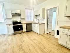 Inside, you’ll find modern updates blended with historic charm. The kitchen has been recently renovated with new cabinets, countertops, and refrigerator, while the bathroom has been stylishly updated. The living room features exposed brick, adding warmth and character you won’t find in typical rentals.