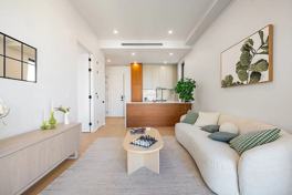 Unit PH2F is a well-designed 1-bedroom, 1-bathroom residence offering 541 square feet of interior living space. The unit features warm wood tones, sleek stone finishes, and high ceilings (10'5" to 10'10"), creating an inviting and sophisticated atmosphere. The modern kitchen is equipped with built-in Bosch appliances?a 5-burner gas cooktop, refrigerator, oven, and dishwasher?complemented by marble countertops. A Bosch washer and dryer is also in the Unit. The luxurious bathroom showcases high-end fixtures, smart toilets, heated floors, and custom LED vanity mirrors. Located in a boutique building with just 52 residences, Oasis offers a range of premium amenities, including a rooftop terrace with panoramic views, a state-of-the-art gym, and secure bicycle storage.