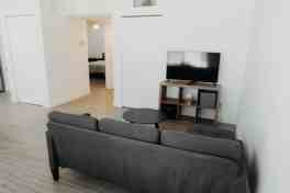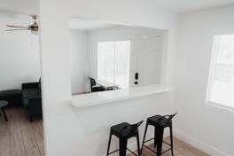 Throughout the main living areas, a sleek plank floor gives a clean, contemporary feel, pairing beautifully with white cabinetry and light walls.