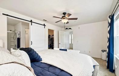 The bedroom offers a walk-in closet, bath equipped w/ dual sinks, & a large tub/shower.