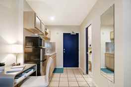 Shared amenities for your convenience. While your private space is compact, Lago features full shared kitchens (with stove, sink, counter, and dining area), coin-operated laundry in-building, and daily janitorial services to keep common areas clean.