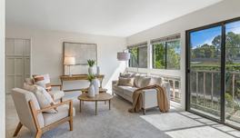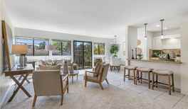 PARK ESTATES NORTH Move-in ready single level end unit condominium with 808 square feet of living space, beautiful views and an excellent location. Open concept floor plan with a generous use of windows provides tons of natural light featuring a great room with plenty of space for a dining room, family room and home office space. Lovely upgraded kitchen with dining area plus additional bar seating. The kitchen cabinets have recently been painted a beautiful Natural Tan by Sherwin-Williams along with new hinges, new outlets, and new pendant lighting. Spacious primary en-suite bedroom has a large walk-in closet and sliders to the balcony with beautiful views of the grassy park. En-suite bathroom has new hinges, dual sinks with Delta Trinsic faucets, walk in shower plus separate soaking tub. Freshly painted interior, new carpet, updated window coverings, updated fixtures, new lighting, and some electrical upgrades throughout. Controlled access security building with two assigned, side by side parking spaces with storage. Convenient community laundry room with two washers and two dryers plus owner lockers. Stroll the nearby park and enjoy the surrounding nature with convenient pedestrian bridge to the neighborhood. Just moments to neighboring CSULB, VA, and Belmont Shore.