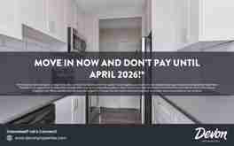 *Terms and conditions apply. To be eligible, you must be a new resident and sign a lease for the specified lease term. The offer is not applicable for those who transfer within the Devon Properties portfolio. This is a one-time offer and may be withdrawn or extended at any time by Devon Properties Ltd. Offers, benefits and services are subject to change and are not an essential, required, or ancillary service provided by the Landlord.