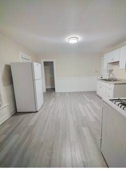 The apartment features refinished hardwood floors in the living and main bedroom, while newer luxury vinyl plank flooring adds a clean, modern touch to the kitchen, bathroom, and second bedroom. The eat-in kitchen includes a refrigerator and gas stove, along with updated cabinets and fresh paint. The bathroom has been refreshed with newer fixtures and a sliding glass tub surround. Ample windows throughout the unit allow for great natural light.