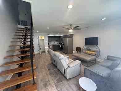 1 Bedroom 1 Bath. Upstairs loft with Bed and Bathroom. Downstairs kitchen, living, and dining area. Television, appliances, kitchenware, linens, pillows, desk, table with chairs, and other furniture and lamps included. Property washroom with multiple pay units and one complementary first come first serve washer dryer unit. All Utilities, internet and 1 designated parking spot on property included.