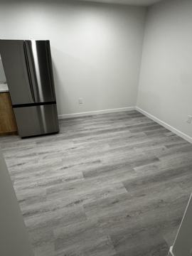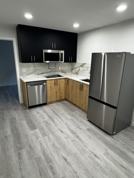 Step into an inviting, open-concept living area featuring durable vinyl plank heated flooring and neutral finishes. The modern kitchen is equipped with stainless steel appliances, including a fridge, stove, microwave, and dishwasher, offering everything you need for easy meal prep and entertaining.