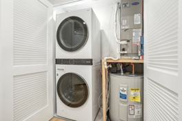 Step inside and you’re immediately greeted by abundant natural light streaming through oversized windows that brighten the open-concept kitchen and living area. The kitchen is a showpiece, offering two-tone white and wood cabinetry, stainless steel appliances (including a dishwasher), modern subway tile backsplash, and hardwood flooring throughout. The spacious living area provides ample room for relaxing or creating a dedicated home office space. Bedrooms comfortably fit queen-sized beds and include expansive closet storage. The luxurious bathroomsfeature white and gray marble tile with matching finishes, creating a clean and timeless aesthetic.