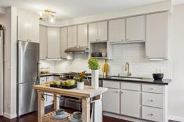 Updated 1+ bedroom, 1-bath flat surrounded by mature trees. The unit includes a versatile office space and an updated bathroom. The kitchen opens to the dining and living area and features a new subway tile backsplash, new countertops, freshly painted cabinetry, new plumbing fixtures, and newer stainless steel appliances. Additional features include an original brick fireplace and new engineered wood flooring. The bedroom offers washer/dryer hookups, mirrored closet doors, and a built-in vanity area. The updated bathroom includes black plumbing fixtures, slate tile, ambient lighting, a backlit medicine cabinet, and efficient storage. The office includes exposed wood beam ceilings, built-in cabinetry and drawers, and a sliding door leading to a private balcony.