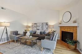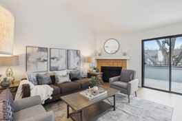 Charming and beautifully updated, this top-floor end unit offers privacy, soaring vaulted ceilings, and an inviting deck off the living/dining area with extra storage. A cozy fireplace with a gas starter adds warmth to the bright living space, while the bedroom features a spacious walk-in closet for ample storage. The fully renovated kitchen shines with brand-new grey-tone cabinetry, quartz countertops, and premium stainless-steel appliances, including a dishwasher, vented LG microwave, and LG electric range. The updated bathroom features a new vanity, and the entire home is enhanced with fresh designer flooring and new paint throughout. Convenient in-unit laundry accommodates a stack-able washer and dryer. This home includes two assigned parking spaces?one covered and one uncovered?and is located in a well-maintained community offering multiple pools, tennis courts, a clubhouse, and an exercise room.