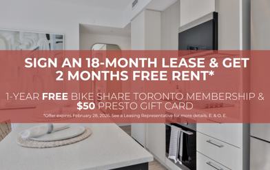 Discover everything you've ever wanted in a downtown urban lifestyle with a modern and professionally managed rental suites now available at Daniels on Parliament. With 25+ years of professional rental management experience, Daniels Gateway Rental Communities™ is trusted by over 4,000 individuals and families across the GTA to deliver exceptional residences and the highest standards of service. Choose from a wide selection of 1 to 3-bedroom suites to accommodate every lifestyle. Experience the best in comfort and contemporary style with access to premium amenities including a Fitness Centre, Wi-Fi Lounge, Co-Working Space, Party Rooms, Screening Lounge, Kids’ Club, resident-exclusive Outdoor Amenity Spaces including BBQ terraces, and so much more! Don’t miss out – claim your place in the city today with our incredible move-in offers! With a prime Downtown East location, Daniels on Parliament is the perfect home for those who want to embrace a vibrant, inclusive and culturally rich neighbourhood packed with great dining, shopping, cafés, recreation, entertainment and schools all close by. Plus, with the TTC at your doorstep, explore the best of the city with ease. For a limited time, every suite gets one (1) $50 PRESTO Card and one (1) FREE 1-Year BikeShare Toronto Membership while quantities last. See Leasing Representative for more details.