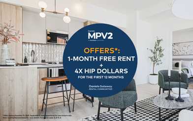 Rent Special available! 4X HIP™ Dollars for the First 12 Months Rent and save for future homeownership with the Daniels Home Investment Program (HIP TM ) – where you can accumulate $500 per month in HIP Dollars (up to $25,000 in HIP dollars) to put toward the purchase of a brand-new Daniels home. This e