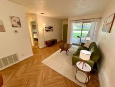 Stylish and modern, this fully furnished condo in Palm Springs Villas I has been beautifully updated. It features a fully remodeled kitchen and bathroom, a brand-new chandelier, fresh interior paint throughout, stylish mid-century decor, attractive herringbone pattern tile flooring, updated electrical and plumbing fixtures, new window treatments and contemporary light fixtures. Additionally, it includes a BRAND-NEW A/C UNIT and thermostat. The condo offers a stunning view of Mt. San Jacinto from both the front patio and the bedroom. Located on the ground floor of the building, there are no stairs to navigate. Community amenities include swimming pools, spas, tennis courts, and laundry facilities. These condominiums are situated on fee land, and the monthly HOA fee covers water, trash, sewer, grounds maintenance, and earthquake insurance