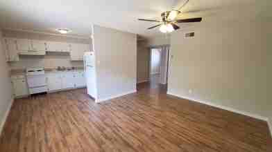 Two bedroom one bathroom apartment with 838 sq. ft. Kitchen has stove/oven and fridge. Ceiling fan in living room and bedrooms. New laminate floors in kitchen and living area. New carpet in the bedrooms. Unit has been freshly painted and professionally cleaned. There is a laundry facility on site. Off road parking provided for tenants.