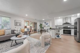 Step inside to find beautiful new flooring, fresh custom paint, new window coverings, and recessed lighting. The kitchen features granite countertops, a brand-new gas stove, a new dishwasher, a garbage disposal, and painted white.